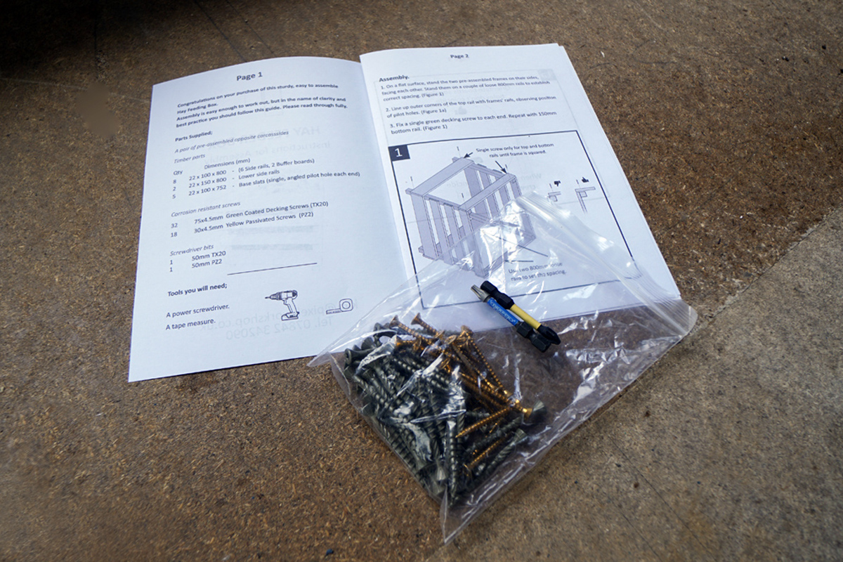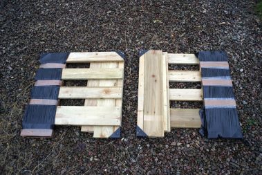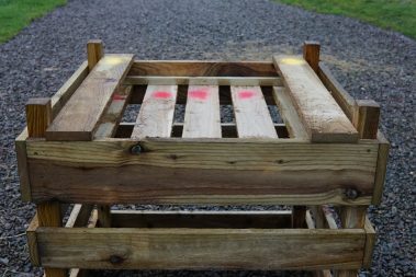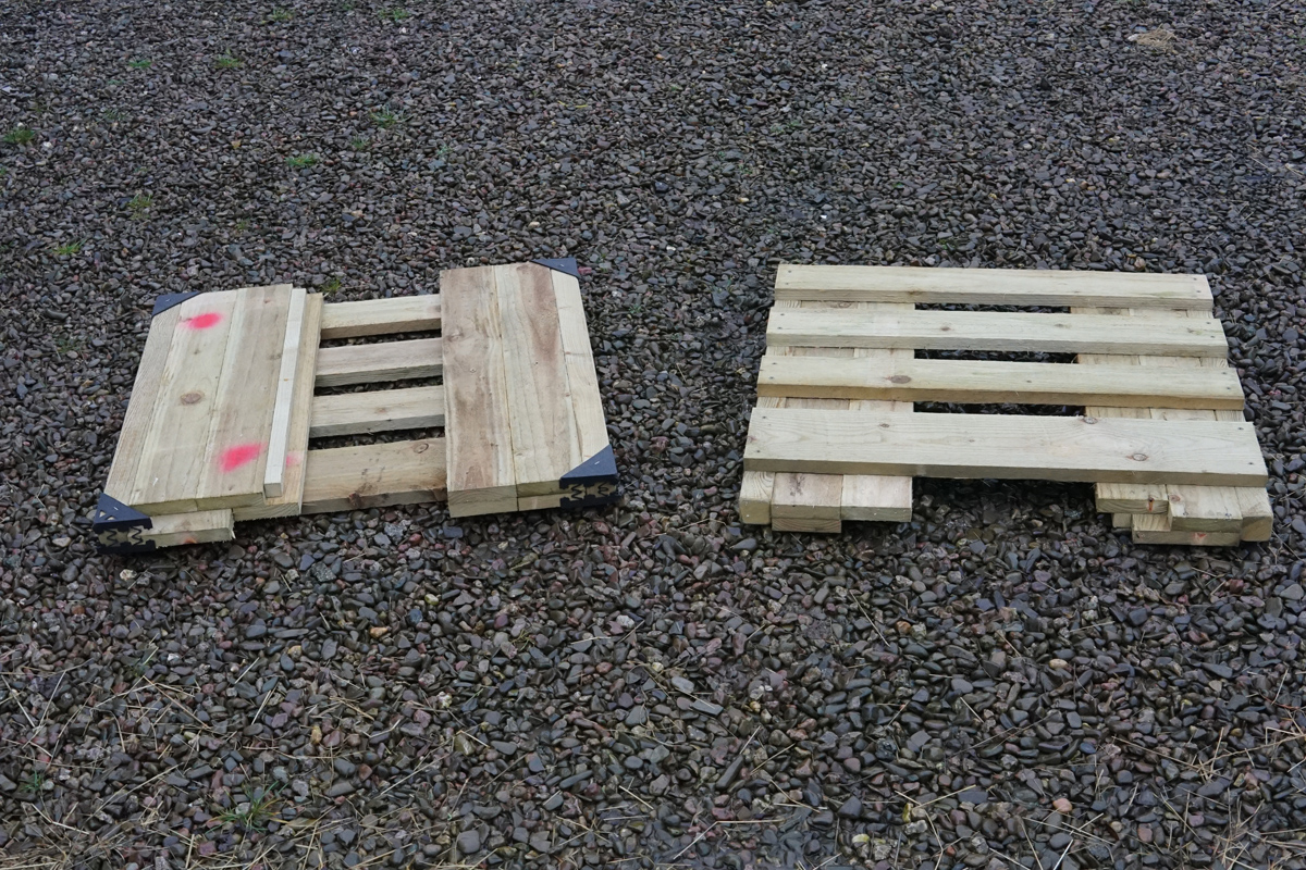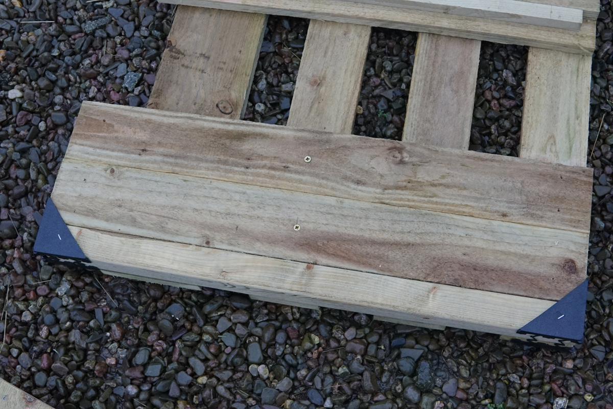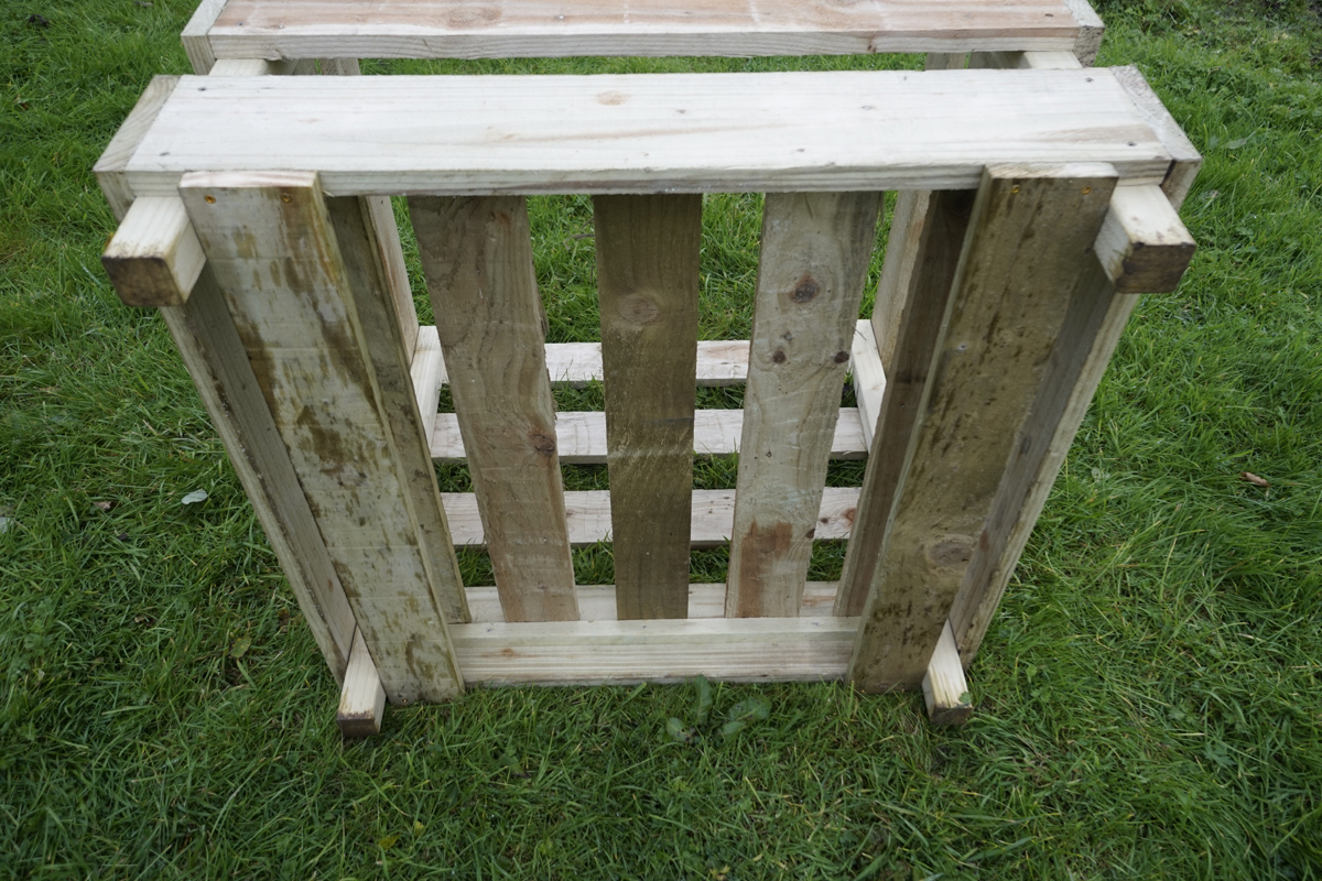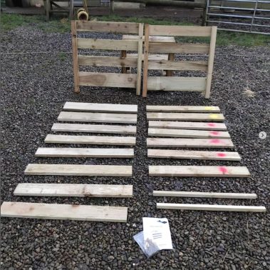 In order to keep delivery costs down the hay feeder box will be divided into two parcels, each parcel having a fully completed side, and half of the remaining boards. These are anchored down and corner protected for transit.